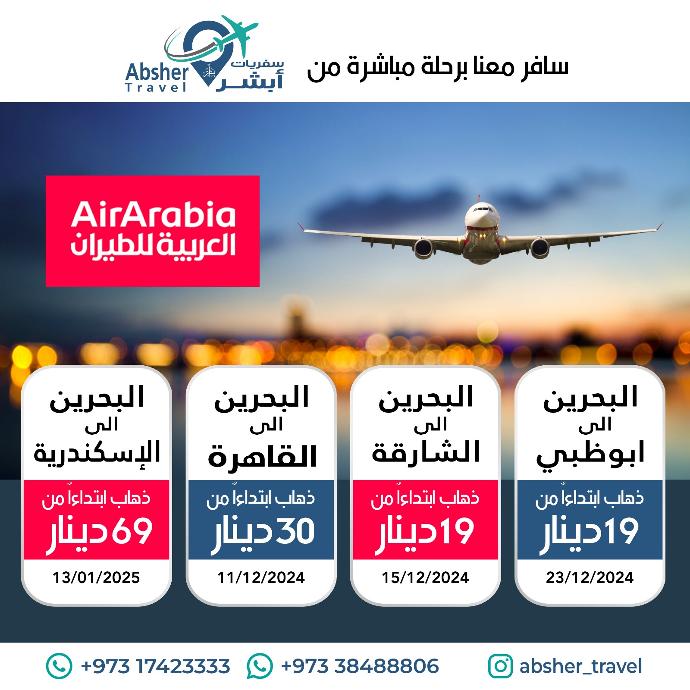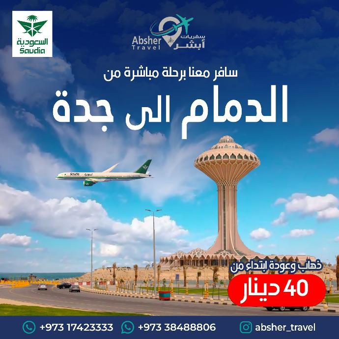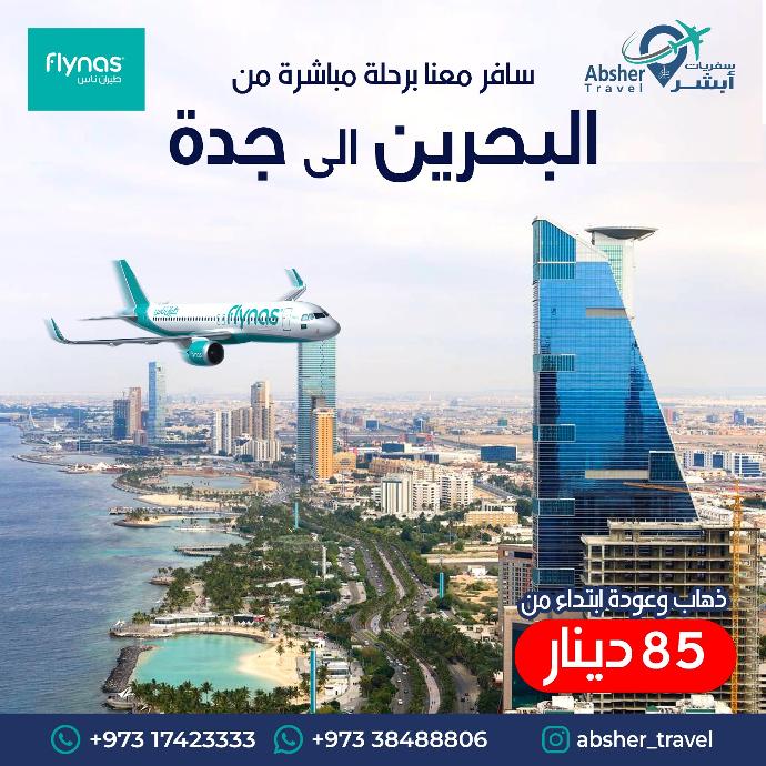 تقدم شركة أبشر للسفر والسياحة أفضل العروض على تذاكر السفر من البحرين إلى جدة، لتستمتع برحلة مريحة وموفرة. نحن ملتزمون بتقديم أعلى مستويات الخدمة لضمان تجربة سفر سلسة وممتعة.