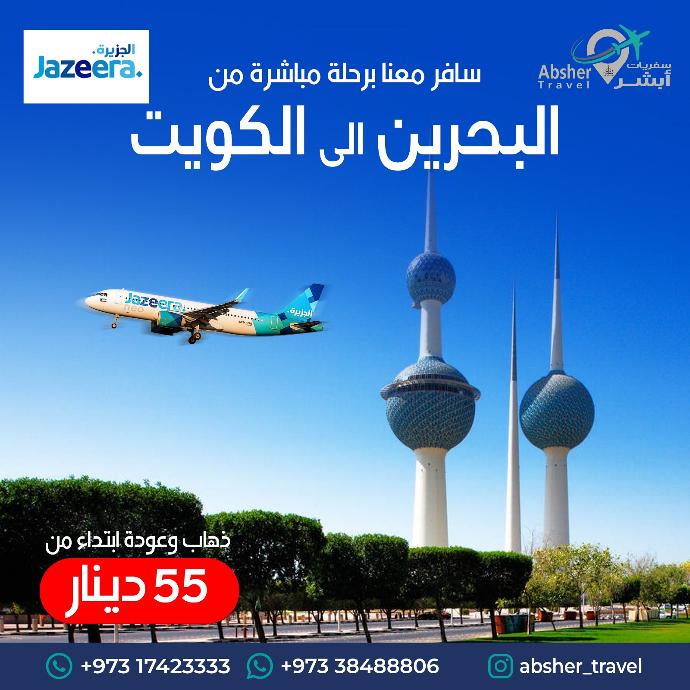 شركة أبشر للسفر والسياحة تقدم لك أفضل العروض على تذاكر السفر من البحرين إلى الكويت، لتستمتع برحلة مريحة وميسرة بأسعار تنافسية. نحن هنا لتوفير كل ما تحتاجه لتجربة سفر سلسة وممتعة.
